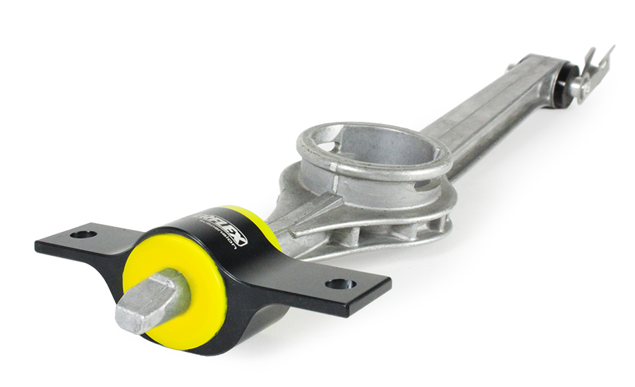 PFF5-1932 Shifter Arm Rear Bush & Bracket – Road is made from in-house CNC-machined 6082-T6 grade aluminium and anodised black to a premium finish. It is paired with a Yellow 70A durometer bush, reducing deflection over the OE rubber bush by over 50% but with minimal NVH transfer.